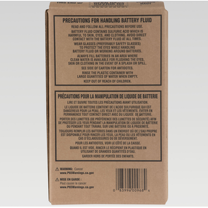 Interstate All Battery Center of Mississauga ON. Battery electrolyte battery grade sulfuric acid in sealed polyethylene pouch with self-contained dispenser tube packaged in sturdy cardboard container. WHEN MATCHING THE REPLACEMENT TO YOUR EXISTING BATTERY PAY SPECIAL ATTENTION TO SIZE AND VOLTAGE AND TRY TO MATCH CAPACITY AH AS CLOSE AS POSSIBLE.